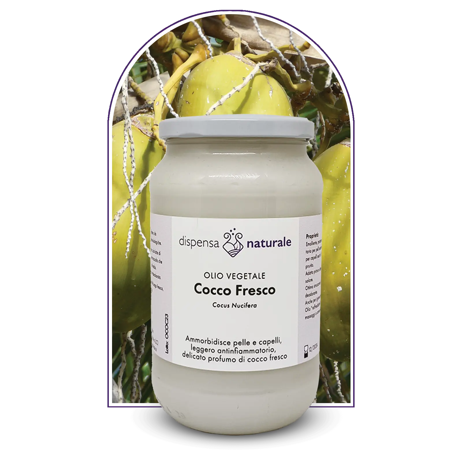 Qualità: Olio "vergine" non deodorato, ottenuto con un metodo unico, centrifugando a freddo (sotto i 50°C) la polpa del cocco appena raccolto.